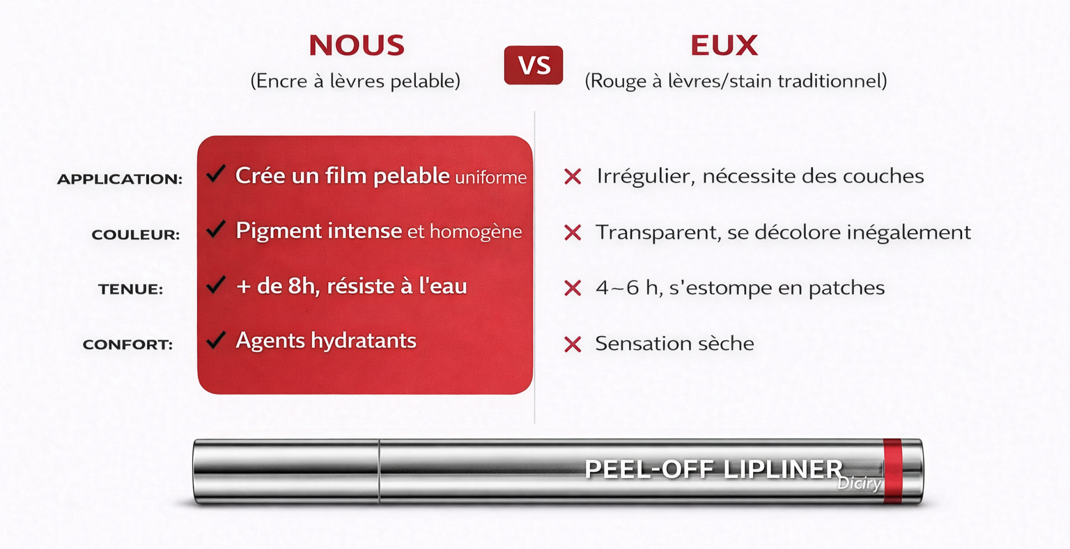 L’encre à lèvres Diciry offre une couleur intense effet tatouage avec un fini mat naturel et longue tenue. Sa formule résistante à l’eau et sans transfert garde vos lèvres parfaitement définies toute la journée.